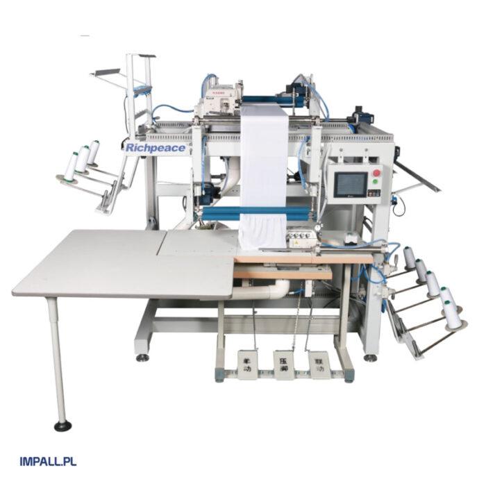 A sewing station designed for the production of mattress protectors. The machine, in one operation, sews elastic to the edge of the material and joins the side of the cover with the top fabric. The machine is available in two versions: